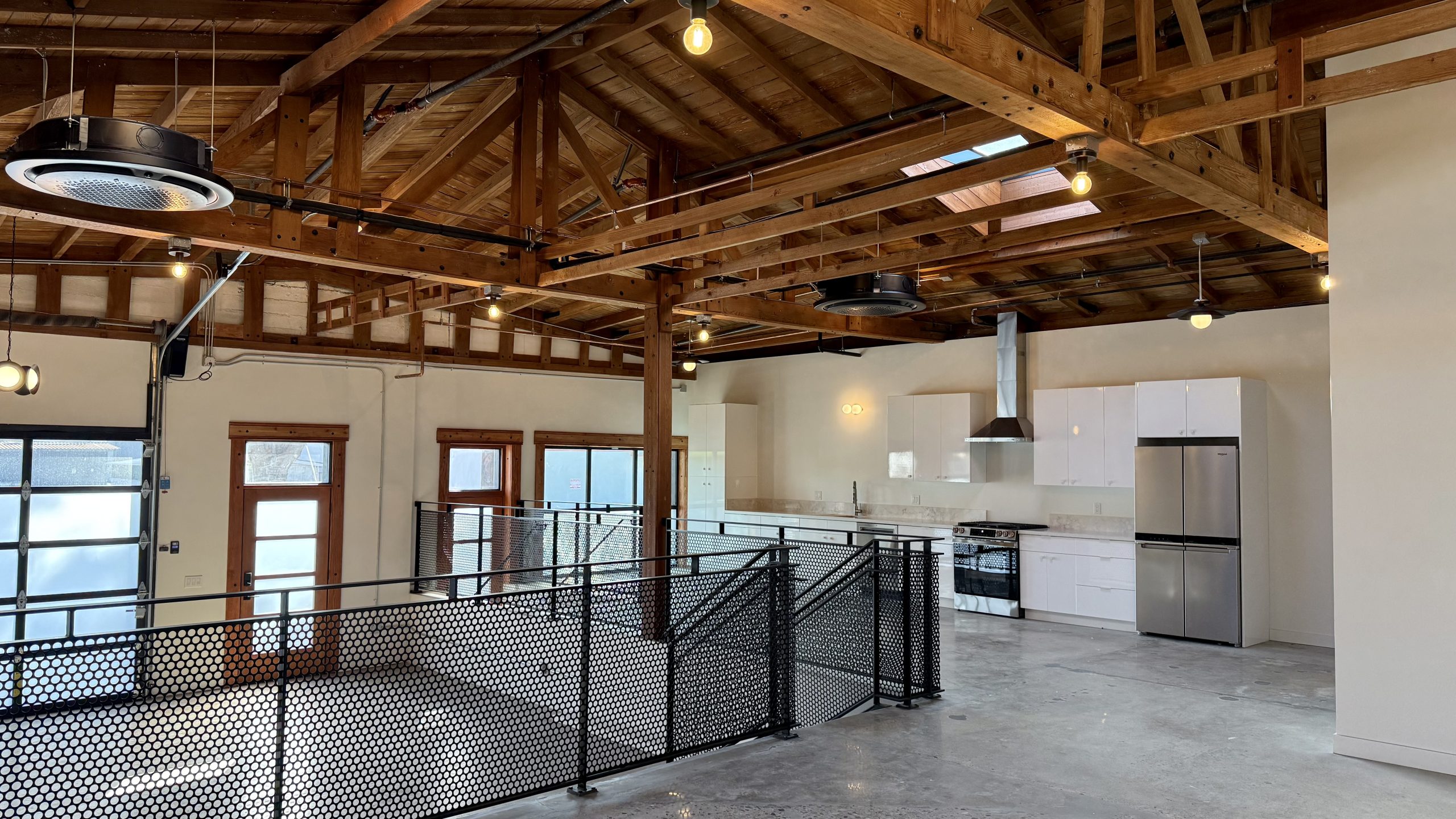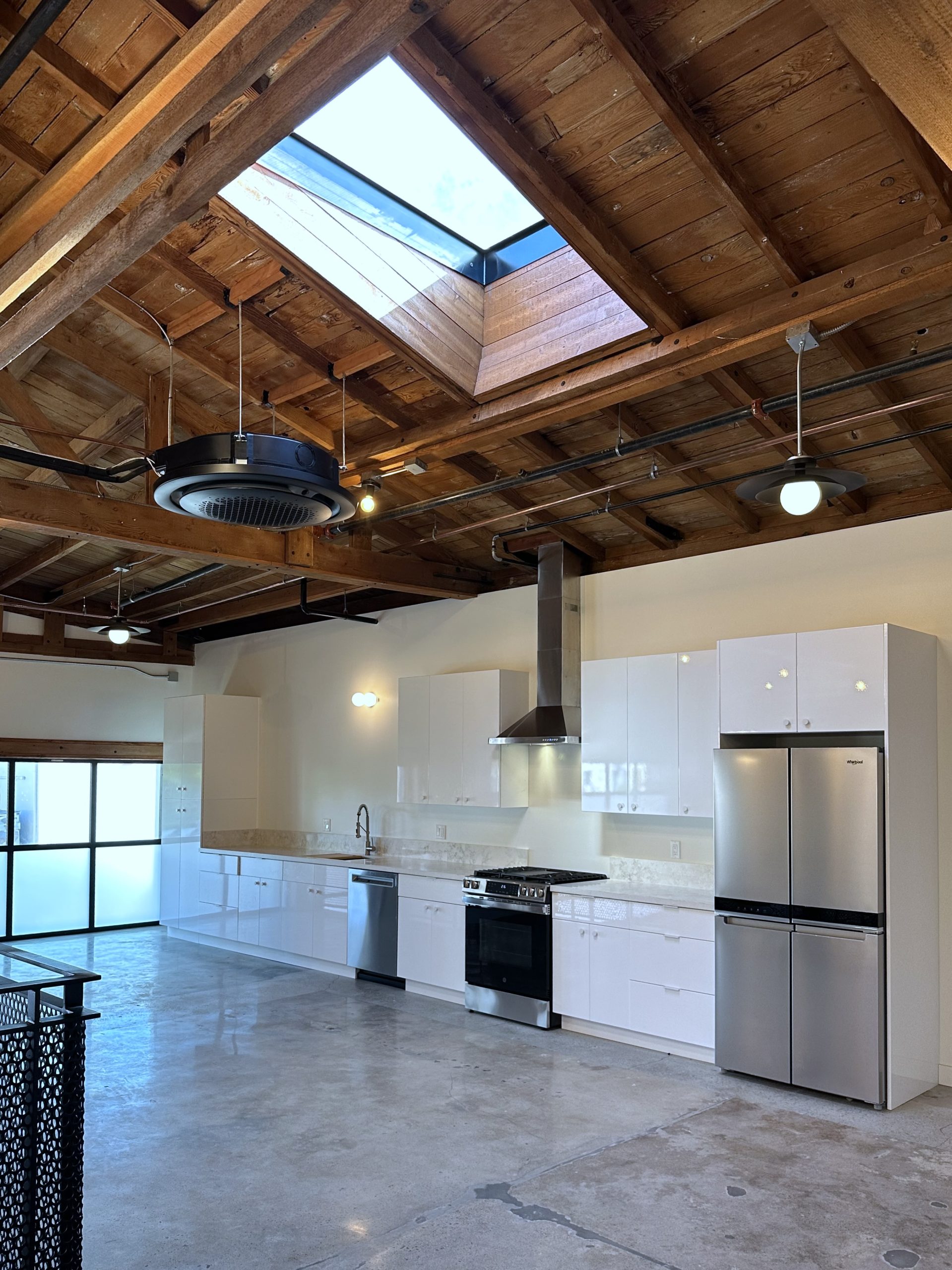 Roll-Up Glass Door + Tall, Beamed Ceilings with Skylights